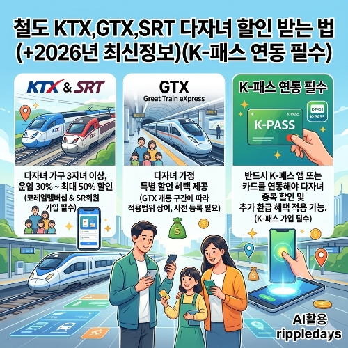 #철도할인 #KTX다자녀할인 #SRT다자녀할인 #GTX다자녀혜택 #K패스다자녀 #2026다자녀혜택 #모두의카드 #대중교통환급 #다자녀가구기준 #기차표할인방법 #정부24다자녀 #다자녀행복할인 #교통비절약 #광역철도할인 #2자녀혜택
